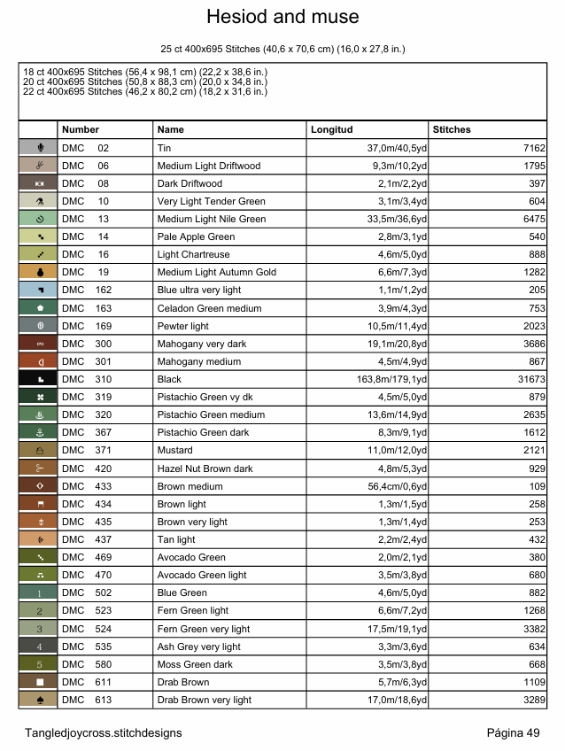El estimado de hilo se ha calculado usando como referencia tela de cuenta de 25 usando una hebra de hilo (mi preferencia personal).