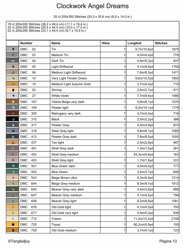 El estimado de hilo se ha calculado usando como referencia tela de cuenta de 25 usando una hecbra de hilo (mi preferencia personal).
