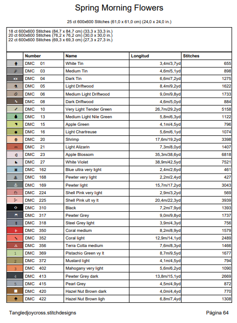 El estimado de hilo se ha calculado usando como referencia tela de cuenta de 25 usando una hecbra de hilo (mi preferencia personal).