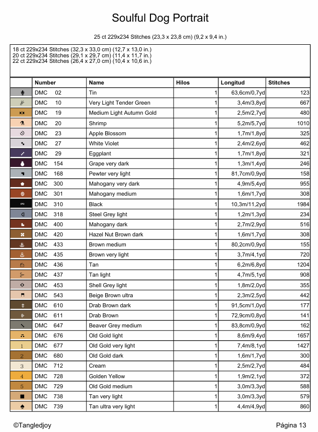 El estimado de hilo se ha calculado usando como referencia tela de cuenta de 25 usando una hecbra de hilo (mi preferencia personal).