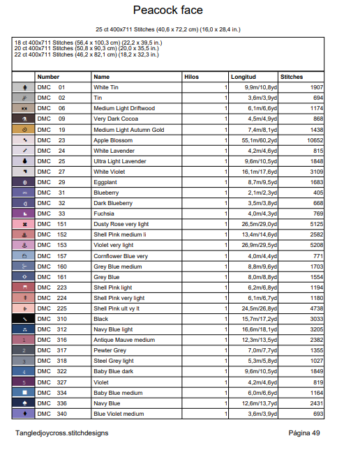 El estimado de hilo se ha calculado usando como referencia tela de cuenta de 25 usando una hecbra de hilo (mi preferencia personal).