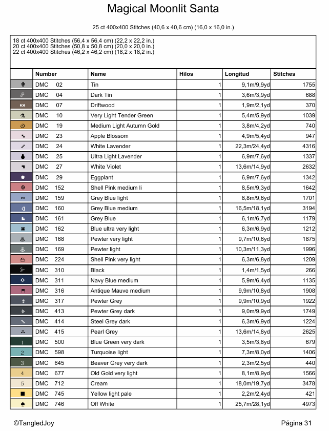 El estimado de hilo se ha calculado usando como referencia tela de cuenta de 25 usando una hecbra de hilo (mi preferencia personal).