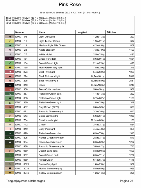 El estimado de hilo se ha calculado usando como referencia tela de cuenta de 25 usando una hebra de hilo (mi preferencia personal).